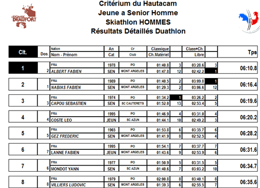 Une édition "résultats détaillés Duathlon" , permet de visualiser le temps de parcours de chacun des concurrents